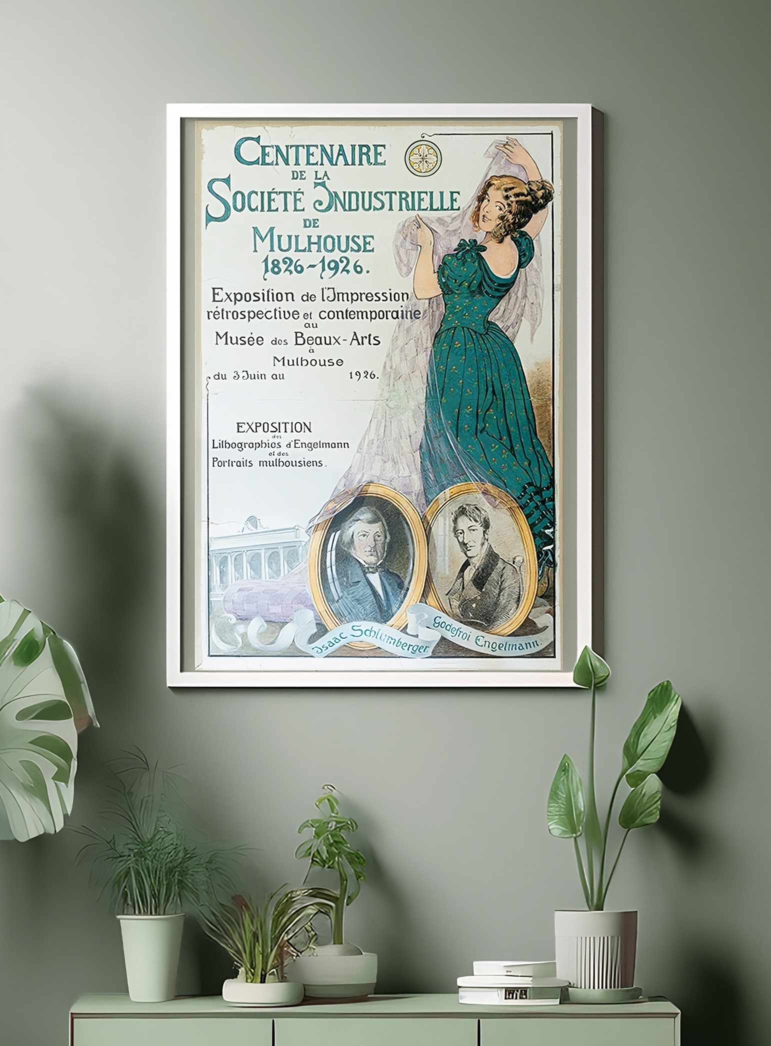 À l’occasion du centenaire de la Société Industrielle de Mulhouse, cette affiche rend hommage à un siècle d’innovation et de savoir-faire industriel. Réalisée en 1926, elle annonçait l’Exposition de l’Impression rétrospective et contemporaine au Musée des Beaux-Arts de Mulhouse, mettant en lumière les lithographies d’Engelmann et les portraits mulhousiens.
